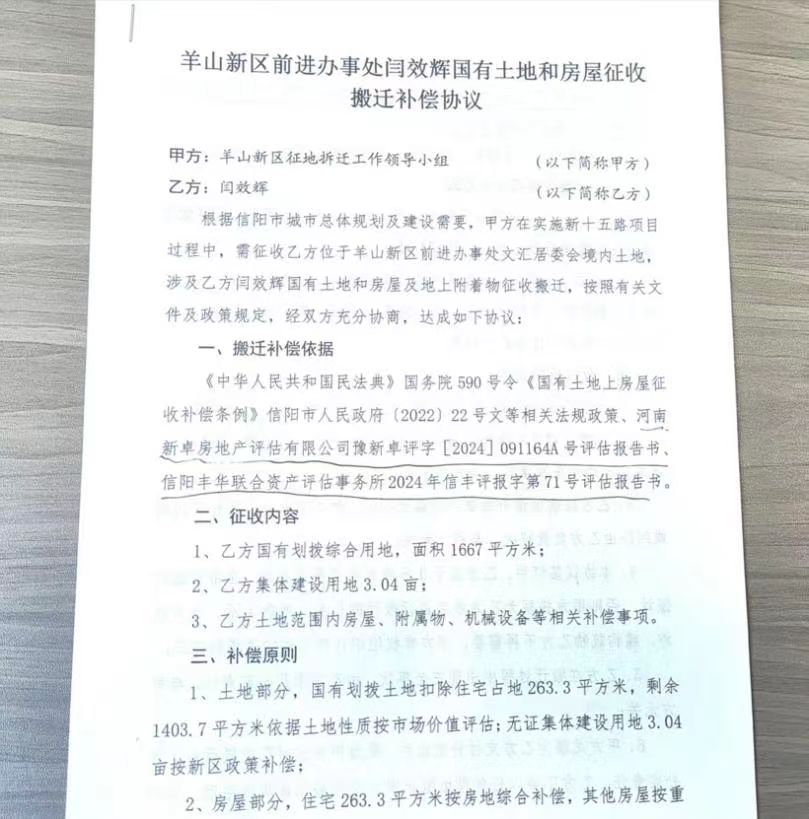 同年8月16日,信阳丰华联合资产评估事务所出具了(信丰评字:2023年51号和52号评估报告),该报告显示,国有土地征收赔偿标准(信阳市区)为94万元一亩,但羊山新区征地拆迁领导小组只给每亩不足30万元。闫家三兄弟要求按有证的土地价值按合法评估结果进行赔付,此要求未得到应允。