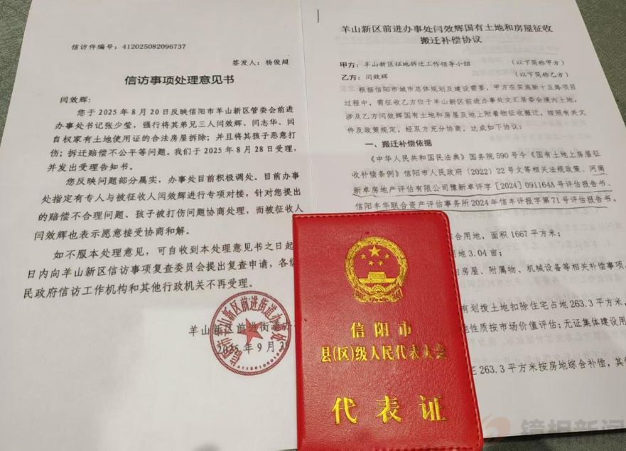 因拆迁儿子遭遇暴打,闫效辉心理上产生了恐惧。他称迫于无奈,他只能代表两个弟弟和羊山新区前进街道办事处交涉拆迁补偿事宜。