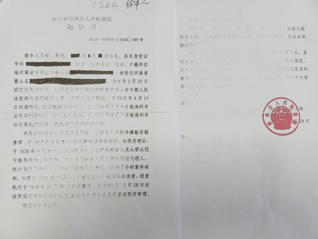 半年后,被涿州市检察院以涉嫌“敲诈勒索罪”向涿州市法院提起公诉。