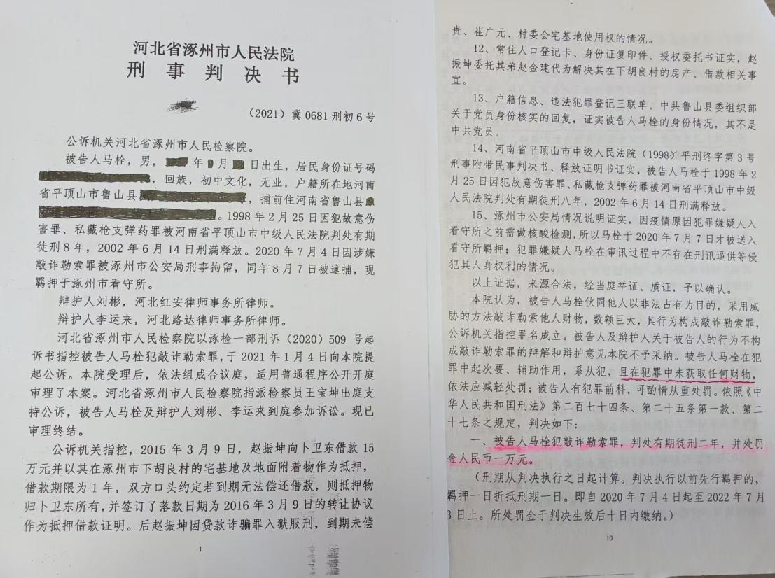 2021年3月31日,涿州市法院以“敲诈勒索罪”判处马栓有期徒刑2年,并处罚金1万元。责令被告人马栓退赔被害人卜卫东人民币10万元。