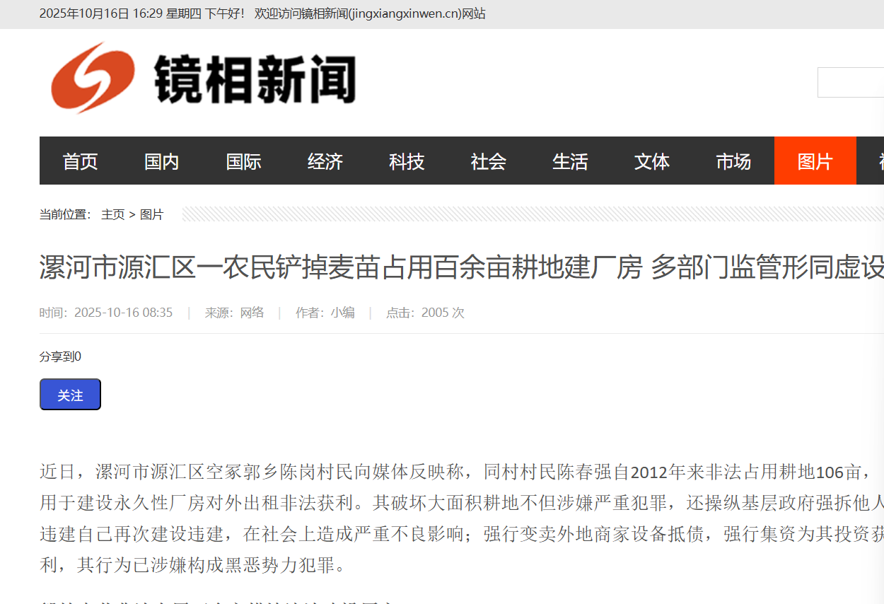 近日,漯河市源汇区空冢郭乡陈岗村民向媒体反映称,同村村民陈春强自2012年来非法占用耕地106亩,用于建设永久性厂房对外出租非法获利。其破坏大面积耕地不但涉嫌严重犯罪,还操纵基层政府强拆他人违建自己再次建设违建,在社会上造成严重不良影响;强行变卖外地商家设备抵债,强行集资为其投资获利,其行为已涉嫌构成黑恶势力犯罪。